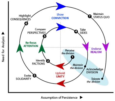 The Spiral is an effortful process which can stop at any Stage if comfort is judged to be sufficient. Progression is driven by (a) personal commitment to the group, (b) the nature of the group and the conflict, (c) social expectations, and (d) limitations of previous modes.