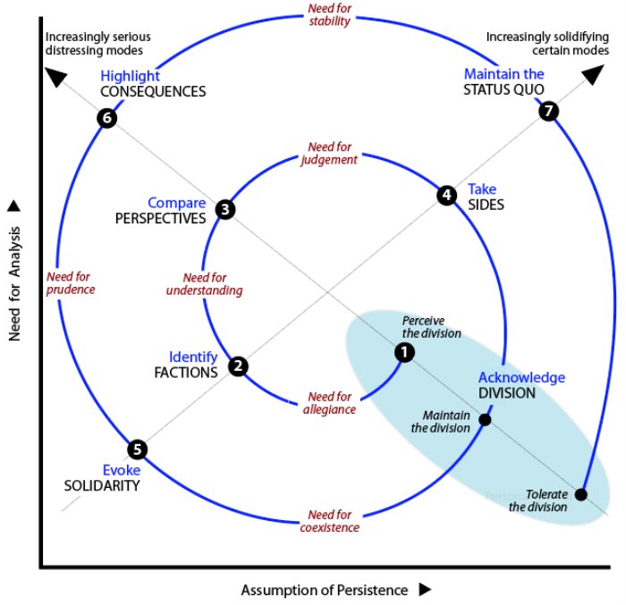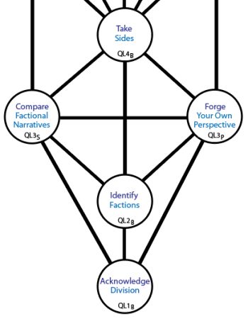 Level 3: Each faction will have its own perspective on the conflict and the division. While their narratives are not under your control, you can compare them. You can also, quite independently, forge your own perspective on the conflict and division.