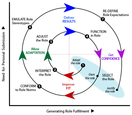 Fitting in to a role commences by because the foundation of fitting in is acknowledgement that social life requires taking on roles. You then fit in maximally by becoming fully identified with a particular role.