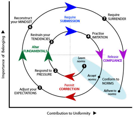 The Spiral is an effortful process which can stop at any Stage if compliance is judged to be sufficient. Progression is driven by (a) your commitment to the group, (b) your comfort with group culture, (c) expectations of group members, and (d) limitations of previous modes.