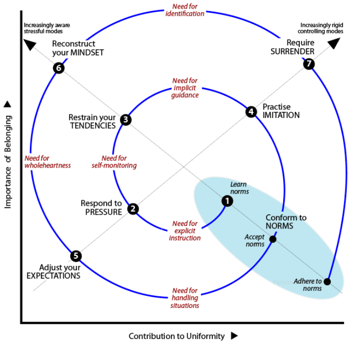 Level 1: Conforming to norms involves both the conformity over which you have full control and the norms over which the social group has control. These two factors cannot be disentangled. Aalthough conformity is a necessity, the ability to conform cannot be taken for granted because cultures are complicated,