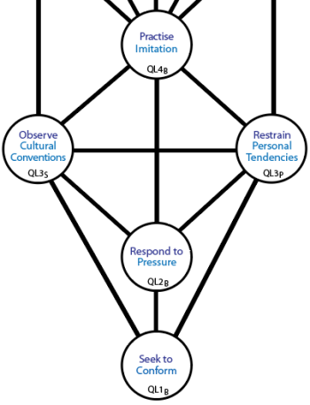 The lower pole of the internal duality appears to be "altering yourself superficially". It corresponds to the inner circle of the TET ("direct, immediate, specific ways to adapt") and Cycle-1 of the Spiral ("becoming like others in the group").