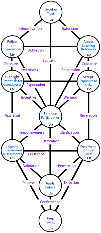 The lowest 3 levels appear to demand a degree of courage: the courage to try, the courage to use personal beliefs, the courage to face realities. Add in participation, and the lower pole of the internal duality can be described as a «courageous involvement». This pole assumes perseverance in participation.