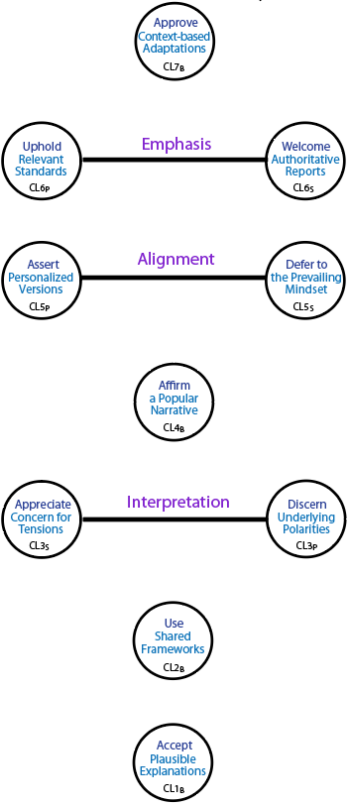 , modes are first treated as levels, and then their essences are considered in terms of practical activities and group expectations. The activities in this case is about clarifying for yourself, offering or exposing an account of a situation, and handling your group's perception of the situation.In this process, the dynamic duality will come into play and we must determine whether the mode essence is primarily determined by personal pressures or by group pressures, or by a fusion of those two poles of the duality. The analysis will proceed level by level starting from below.